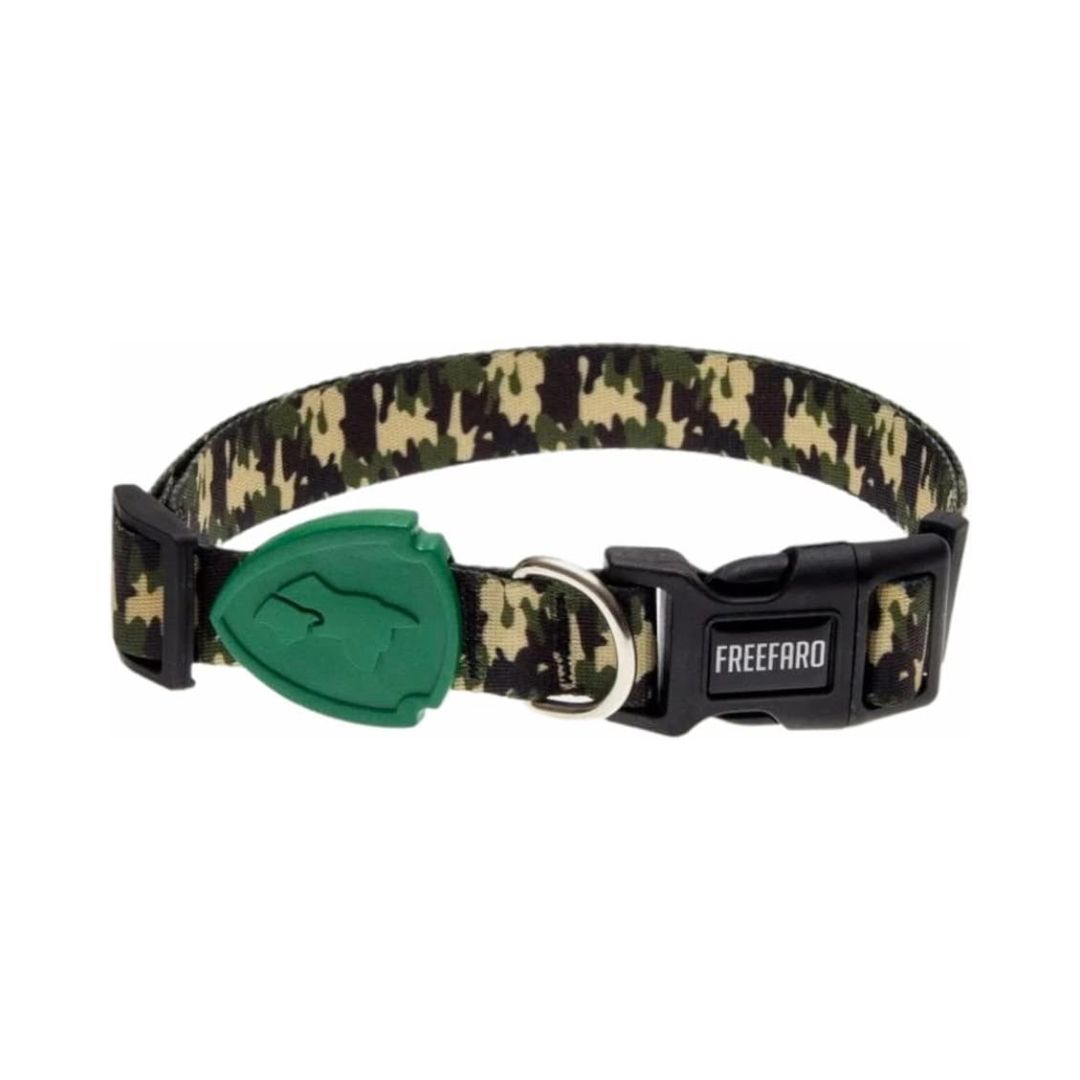 A estampa New Army é a linha de camuflagem do seu pet. Inspirada em nossa natureza e como ela se entrelaça com a biodiversidade, ela trás o preto e tons de verde em suas cores principais. A Coleira FreeFaro foi projetada para ter conforto. Ela é ajustável e se encaixa perfeitamente ao pescoço do seu pet, trazendo segurança no momento de passeio. Tira em Poliéster super macio e resistente é a mesma utilizada em cintos de segurança. Tecnologia inTransfer® garante a estampa com cores mais vivas. 100% ajustável ao corpo do animal (verifique a tabela e tamanhos). Fecho resistente com engate rápido e 4 pontos de segurança.